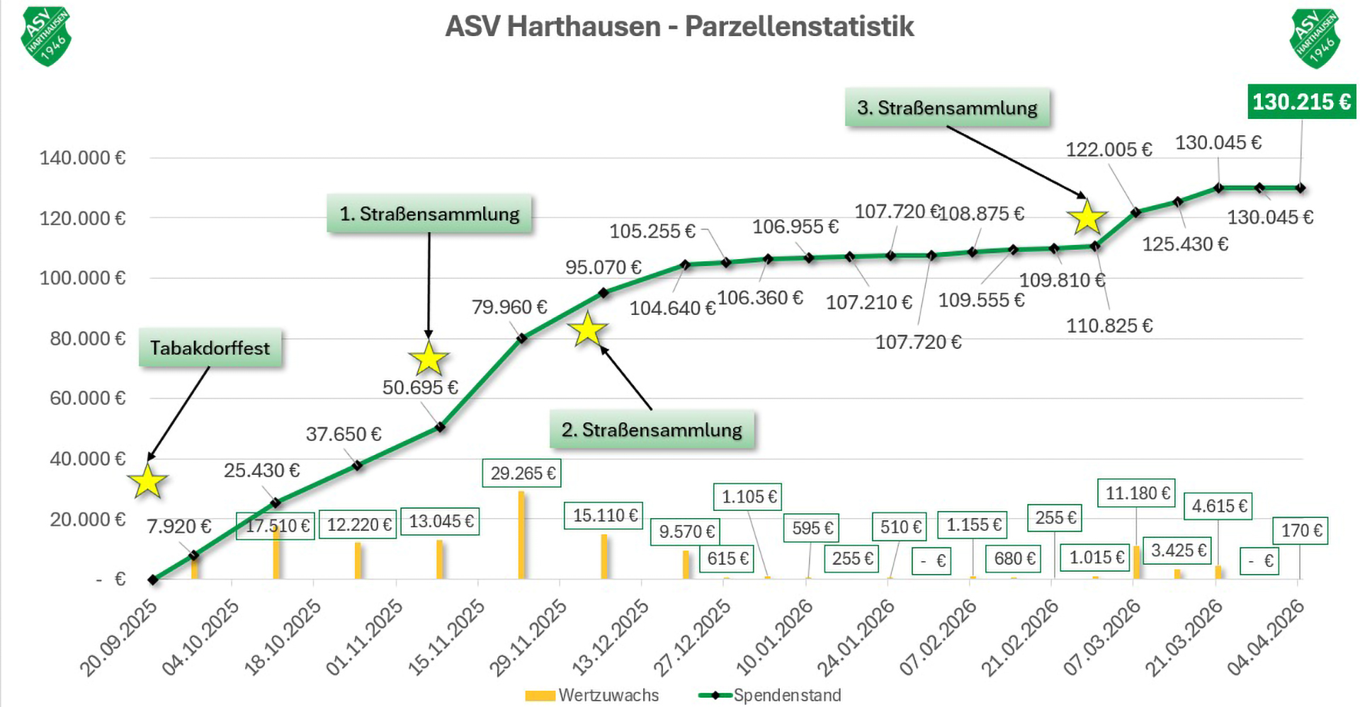 Unsere Online-Spendenplattform wird aber weiter aktiv bleiben, da wir noch *62 🟥 Parzellen* vergeben können. Die Dankestafel wird somit ein echter Hingucker am neuen Spielfeld. Alle großen Spendenfelder sind bereits vergeben - *es ist unglaublich!*
