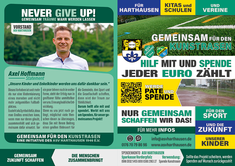 Im Rahmen des laufenden Kunstrasen-Projekts bin ich einfach nur dankbar, dass sich die harte Arbeit gelohnt hat und wir bereits so viel erreicht haben. Die Gemeinde, die Mitbürger, unsere Mitglieder und auch andere Vereine haben bewiesen, dass sie hinter uns stehen und an uns glauben. Unser Projektteam hat so viel Zeit investiert und Nächte an den Zuschussanträgen verbracht. Wie viel haben wir diskutiert, philosophiert oder gerechnet, dass ich mich heute schon wieder frage, wie haben wir das überhaupt geschafft? Wir stehen wirklich sehr kurz vor der Umsetzung.
